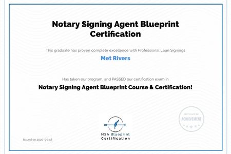Trained and mentored by one of our nations best Notary Signing Agents, Jon Snedeker. Successfully completed NSA Blueprint